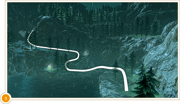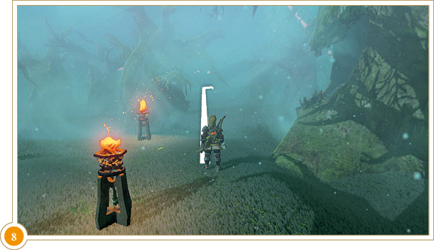 Tournez immédiatement à gauche après avoir franchi les deux torches, puis bifurquez vers la droite (en direction de l’ouest) quand vous arrivez à hauteur du gros arbre qui émerge de la brume sur l’image.