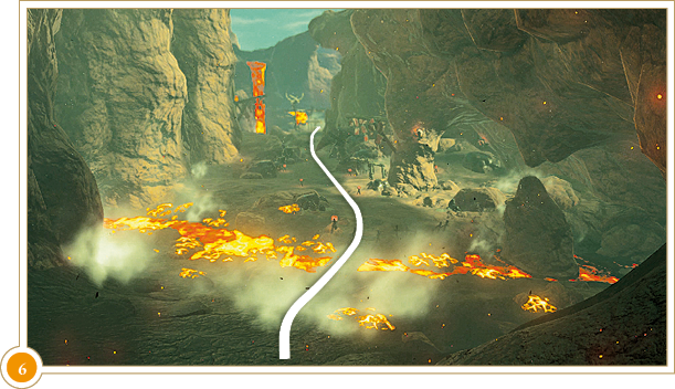 Neuvième trésor : Ouvrez la carte et redressez Vah’Rudania à la verticale. Placez-vous alors de nouveau sous la poutre qui traverse la pièce en diagonale, puis inclinez la créature derechef pour vous retrouver à la base de la longue rampe. Gravissez la pente et laissez-vous tomber près de la lanterne (que vous avez allumée lors d’une précédente étape). Tirez une flèche sur le globe oculaire afin de faire disparaître toute la matière pourpre. Avancez ensuite de quelques pas et débarrassez-vous dans la foulée de l’œil accroché sous la plateforme voisine. Une fois que la voie est libre, suivez le chemin dessiné sur l’image pour accéder au coffre qui repose à l’autre bout de la passerelle, sur la crête de la créature divine.
