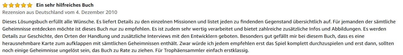 „Dieses Lösungsbuch erfüllt alle Wünsche. Es liefert Details zu den einzelnen Missionen und listet jeden zu findenden Gegenstand übersichtlich auf. Für jemanden, der sämtliche Geheimnisse entdecken möchte, ist dieses Buch nur zu empfehlen. Es ist zudem sehr wertig verarbeitet und bietet zahlreiche zusätzliche Infos und Abbildungen. Es werden Details zur Geschichte, den Orten der Handlung und zusätzliche Interviews mit den Entwicklern geboten. Besonders gut gefällt mir bei diesem Buch, dass es eine herausnehmbare Karte zum Aufklappen mit sämtlichen Geheimnissen enthält. […] Für Trophäensammler einfach erstklassig.“