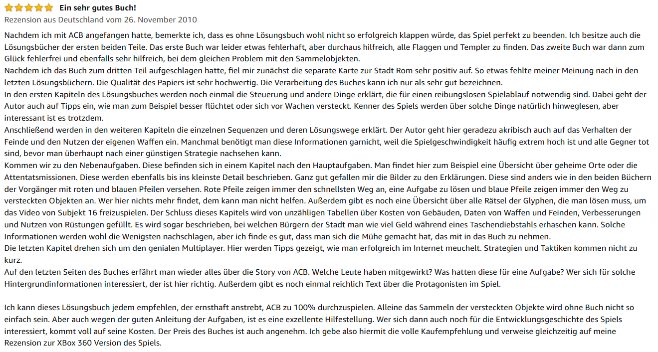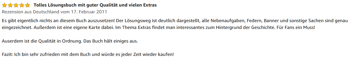 „Es gibt eigentlich nichts an diesem Buch auszusetzen! Der Lösungsweg ist deutlich dargestellt, alle Nebenaufgaben, Federn, Banner und sonstige Sachen sind genau eingezeichnet. Außerdem ist eine eigene Karte dabei. Im Kapitel ‚Extras‘ findet man Interessantes zum Hintergrund der Geschichte. Für Fans ein Muss! Auserdem ist die Qualität in Ordnung. Das Buch hält einiges aus. Fazit: Ich bin sehr zufrieden mit dem Buch und würde es jederzeit wieder kaufen!“