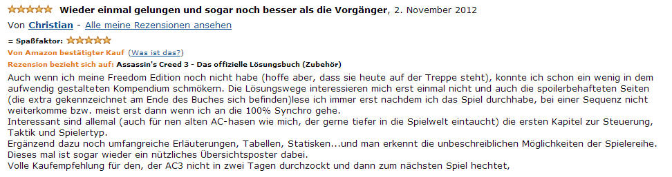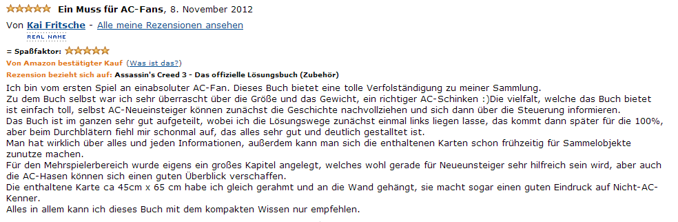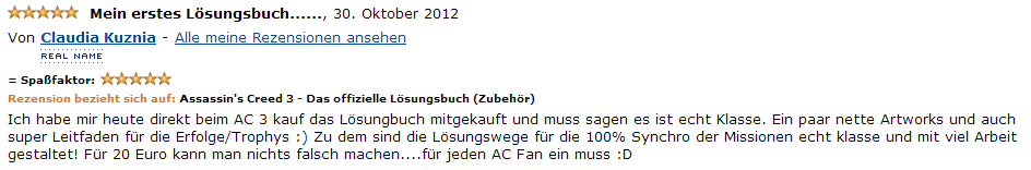 „Ich habe mir heute beim AC3-Kauf direkt das Lösungbuch mitgekauft und muss sagen, es ist echt klasse. Ein paar nette Artworks und auch ein super Leitfaden für die Erfolge/Trophies. Zudem sind die Lösungswege für die 100%-Synchro der Missionen echt klasse und mit viel Arbeit gestaltet! Für 20 Euro kann man nichts falsch machen… Für jeden AC-Fan ein Muss!“