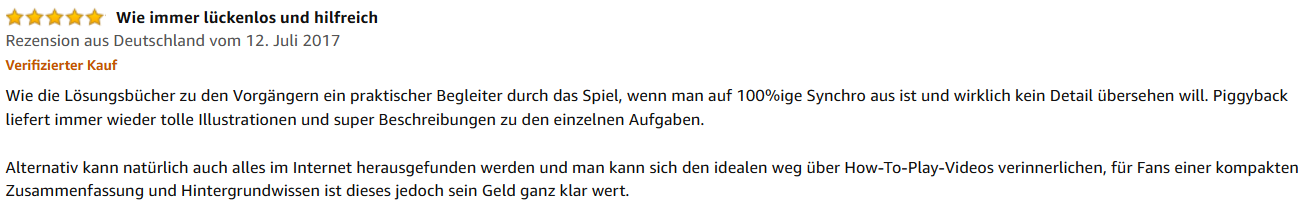 „Wie die Lösungsbücher zu den Vorgängern ein praktischer Begleiter durch das Spiel, wenn man auf 100%ige Synchro aus ist und wirklich kein Detail übersehen will. Piggyback liefert immer wieder tolle Illustrationen und super Beschreibungen zu den einzelnen Aufgaben.“