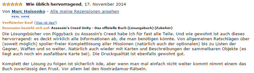 „Die Lösungsbücher von Piggyback zu Assassin’s Creed habe ich für fast alle Teile. Und wie gewohnt ist auch dieses hervorragend: Es deckt wirklich alle Informationen ab, die man benötigen könnte. Von allgemeinen Ratschlägen über (soweit möglich) spoilerfreie Komplettlösung aller Missionen – natürlich auch der optionalen – bis zu Listen der Gegner, Waffen usw. Natürlich auch wieder mit Karten und Beschreibungen der sammelbaren Objekte, es liegt auch noch eine ausfaltbare Karte bei. Die Druckqualität ist ebenfalls gewohnt gut. Komplett der Lösung zu folgen ist sicherlich öde, aber wenn man einmal einfach nicht weiterkommt, nimmt einem das Buch zuverlässig den Frust. Vor allem bei den Nostradamus-Rätseln.“