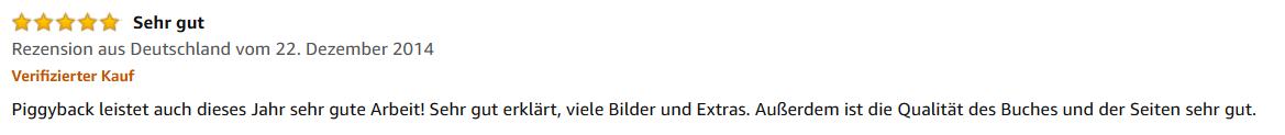 „Piggyback leistet auch dieses Jahr sehr gute Arbeit! Sehr gut erklärt, viele Bilder und Extras. Außerdem ist die Qualität des Buches und der Seiten sehr gut.“