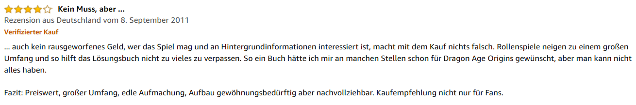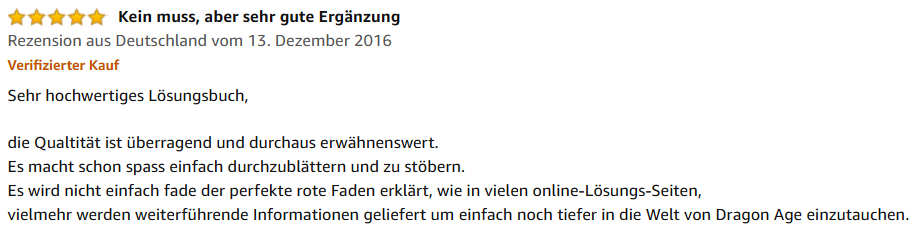 „Sehr hochwertiges Lösungsbuch, die Qualtität ist überragend und durchaus erwähnenswert. Es macht schon Spaß, einfach durchzublättern und zu stöbern. Es wird nicht einfach fade der perfekte rote Faden erklärt, wie auf vielen Online-Lösungseiten, viel mehr werden weiterführende Informationen geliefert, um einfach noch tiefer in die Welt von Dragon Age einzutauchen.“
