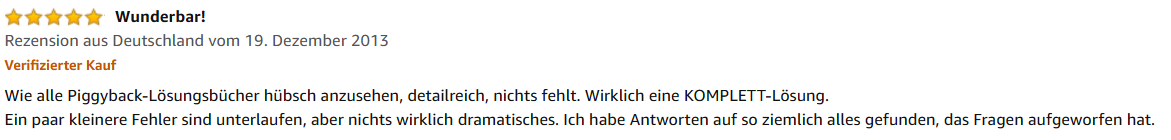 „Wie alle Piggyback-Lösungsbücher hübsch anzusehen, detailreich, nichts fehlt. Wirklich eine KOMPLETT-Lösung. Ein paar kleinere Fehler sind unterlaufen, aber nichts wirklich Dramatisches. Ich habe Antworten auf so ziemlich alles gefunden, das Fragen aufgeworfen hat.“