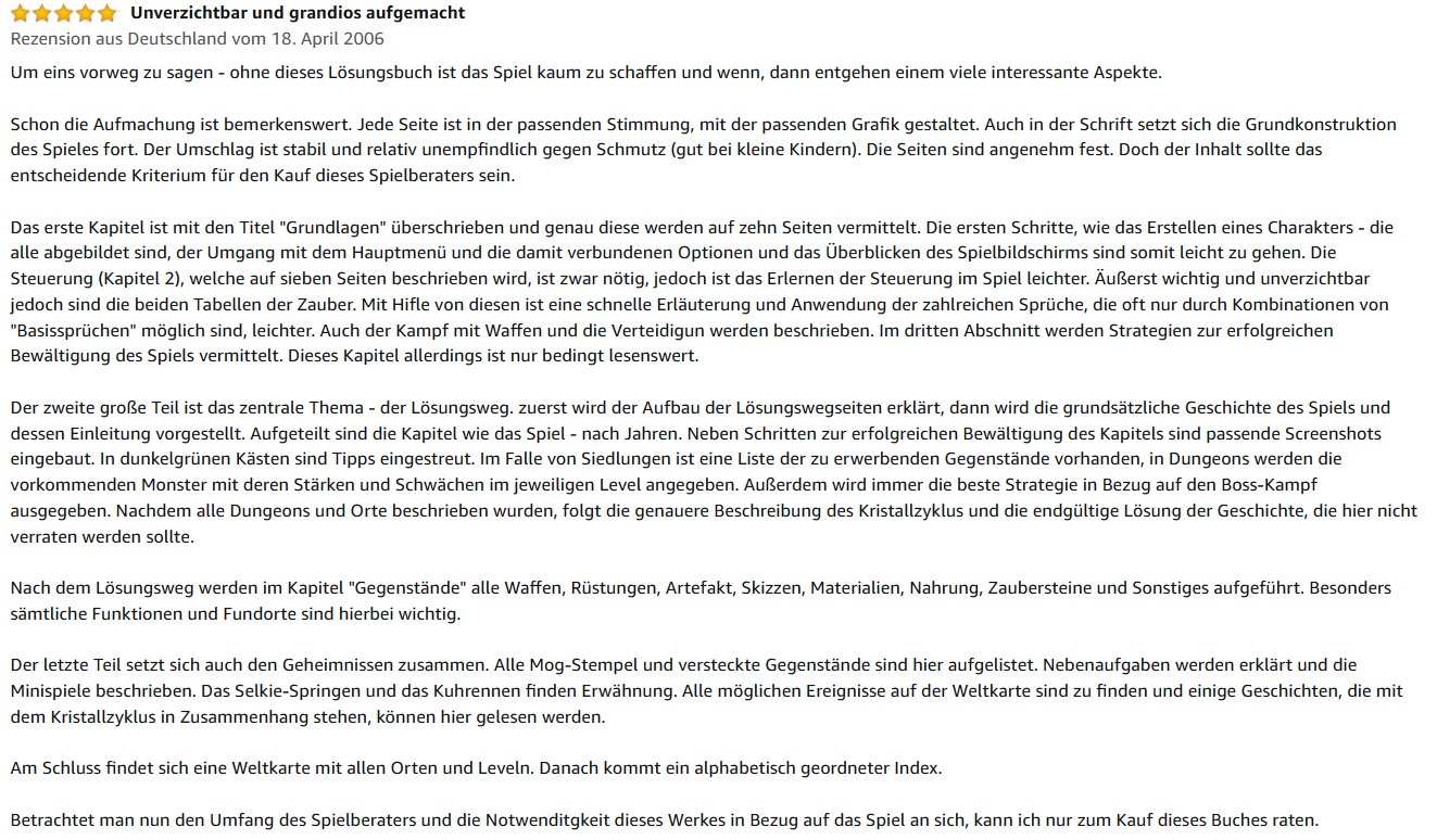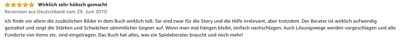 „Wirklich sehr hübsch gemacht! Ich finde vor allem die zusätzlichen Bilder in dem Buch wirklich toll. Sie sind zwar für die Story und die Hilfe irrelevant, aber trotzdem. Der Berater ist wirklich aufwendig gestaltet und zeigt die Stärken und Schwächen sämmtlicher Gegner auf. Wenn man mal hängen bleibt, einfach nachschlagen. Auch Lösungswege werden vorgeschlagen und alle Fundorte von Items etc. sind eingetragen. Das Buch hat alles, was ein Spieleberater braucht und noch mehr!“