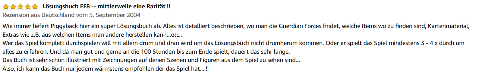 „Wie immer liefert Piggyback hier ein super Lösungsbuch ab. Alles ist detalliert beschrieben, wo man die Guerdian Forces findet, welche Items wo zu finden sind, Kartenmaterial, Extras wie z.B. aus welchen Items man andere herstellen kann etc. Wer das Spiel komplett durchspielen will mit allem drum und dran, wird um das Lösungsbuch nicht herumkommen. Oder er spielt das Spiel mindestens 3-4x durch, um alles zu erfahren. Und da man gut und gerne an die 100 Stunden bis zum Ende spielt, dauert das sehr lange. Das Buch ist sehr schön illustriert mit Zeichnungen auf denen Szenen und Figuren aus dem Spiel zu sehen sind. Also, ich kann das Buch nur jedem wärmstens empfehlen, der das Spiel hat!“
