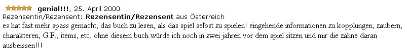 „Es hat fast mehr Spaß gemacht, das Buch zu lesen, als das Spiel selbst zu spielen! Eingehende Informationen zu Kopplungen, Zaubern, Charakteren, G.F., Items, etc. Ohne dieses Buch würde ich noch in zwei Jahren vor dem Spiel sitzen und mir die Zähne daran ausbeißen!“