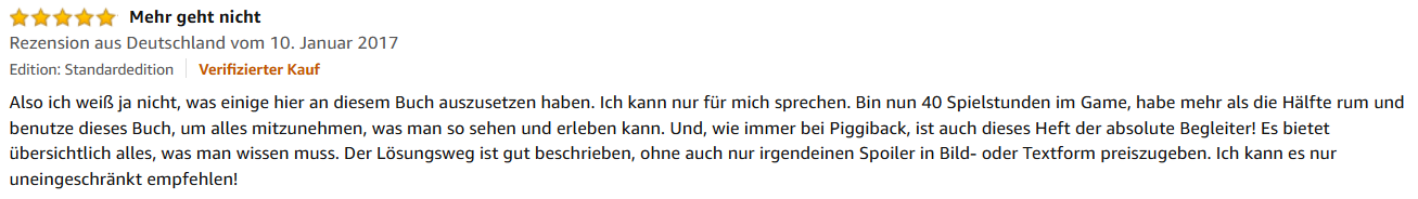 „Bin nun 40 Spielstunden im Game, habe mehr als die Hälfte rum und benutze dieses Buch, um alles mitzunehmen, was man so sehen und erleben kann. Und, wie immer bei Piggiback, ist auch dieses Heft der absolute Begleiter! Es bietet übersichtlich alles, was man wissen muss. Der Lösungsweg ist gut beschrieben, ohne auch nur irgendeinen Spoiler in Bild- oder Textform preiszugeben. Ich kann es nur uneingeschränkt empfehlen!“