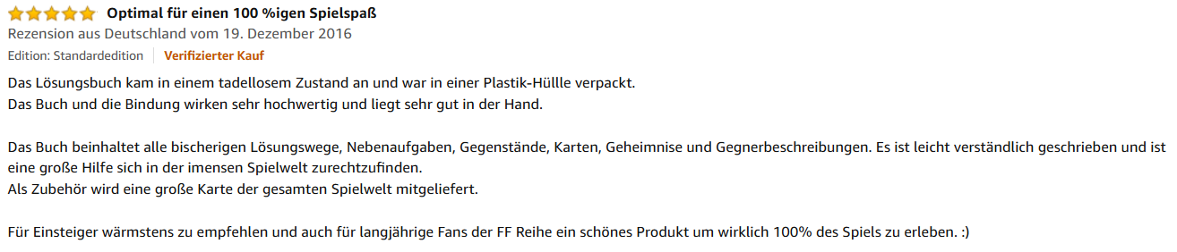 „Das Buch und die Bindung wirken sehr hochwertig und liegt sehr gut in der Hand. Das Buch beinhaltet alle bisherigen Lösungswege, Nebenaufgaben, Gegenstände, Karten, Geheimnisse und Gegnerbeschreibungen. Es ist leicht verständlich geschrieben und eine große Hilfe, um sich in der immensen Spielwelt zurechtzufinden. Als Zubehör wird eine große Karte der gesamten Spielwelt mitgeliefert. Für Einsteiger wärmstens zu empfehlen und auch für langjährige Fans der FF-Reihe ein schönes Produkt, um wirklich 100% des Spiels zu erleben.“
