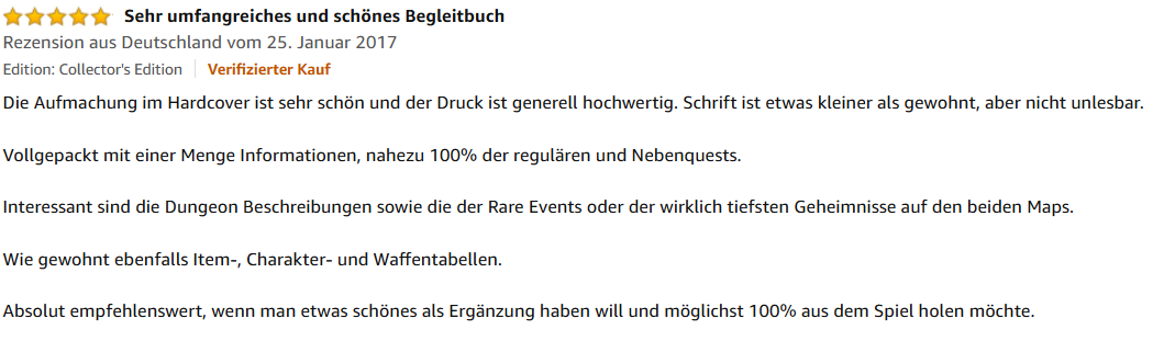„Die Aufmachung im Hardcover ist sehr schön und der Druck ist generell hochwertig. Schrift ist etwas kleiner als gewohnt, aber nicht unlesbar. Vollgepackt mit einer Menge Informationen, nahezu 100% der regulären und Nebenquests. Interessant sind die Dungeon-Beschreibungen sowie die der Rare-Events oder der wirklich tiefsten Geheimnisse auf den beiden Maps. Wie gewohnt ebenfalls Item-, Charakter- und Waffentabellen. Absolut empfehlenswert, wenn man etwas schönes als Ergänzung haben will und möglichst 100% aus dem Spiel holen möchte.“