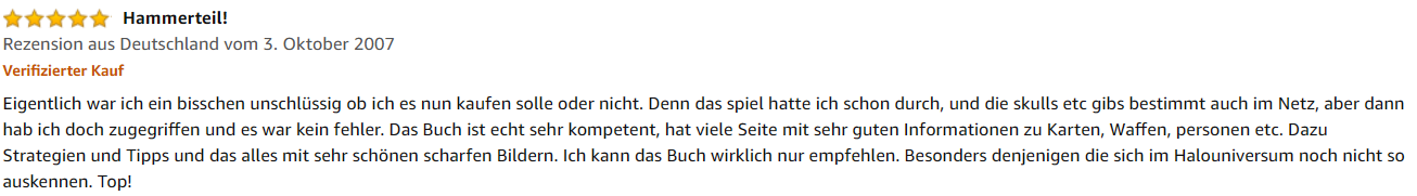 „Eigentlich war ich ein bisschen unschlüssig, ob ich das Buch nun kaufen soll oder nicht. Denn das Spiel hatte ich schon durchgespielt, und die Fundorte der Skulls etc. gibt es bestimmt auch im Netz. Aber dann habe ich doch zugegriffen, und es war kein Fehler. Das Buch ist echt sehr kompetent, hat viele Seiten mit sehr guten Informationen zu Karten, Waffen, Personen etc. Dazu Strategien und Tipps, und das alles mit sehr schönen scharfen Bildern. Ich kann das Buch wirklich nur empfehlen – besonders denjenigen, die sich im Halo-Universum noch nicht so gut auskennen. Top!“