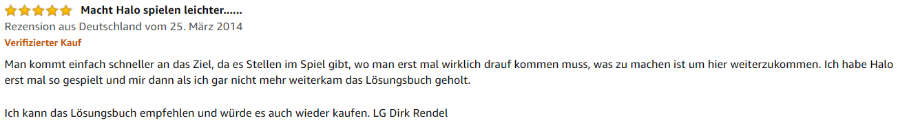 „Man kommt mit diesem Buch einfach schneller ans Ziel, da es Stellen im Spiel gibt, an denen man erst einmal darauf kommen muss, was zu tun ist, um weiterzukommen. Ich habe Halo zunächst ohne Buch gespielt und mir dann, als ich gar nicht mehr weiterkam, das Lösungsbuch gekauft. Ich kann das Buch empfehlen und würde es auch wieder kaufen!“