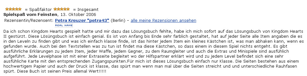 „Da ich schon Kingdom Hearts gespielt hatte und mir dazu das Lösungsbuch fehlte, habe ich mich sofort auf das Lösungsbuch von Kingdom Hearts II gestürzt. Diese Lösungsbuch ist einfach genial. Es ist von Anfang bis Ende sehr farbig gestaltet, hat auf jeder Seite alle Item-Angaben, die es in den Leveln zu finden gibt – und, was ich einfach klasse finde, ist, dass hinter jedem Item ein kleines Kästchen ist, was man abhaken kann, wenn es gefunden wurde. Auch bei den Textstellen, was zu tun ist, findet man diese Kästchen, so dass einem in diesem Spiel nichts entgeht. Es gibt ausführliche Erklärungen zu jedem Item, jeder Waffe, jedem Gegner, zu dem Raumgleiter, und auch die Extras und Minispiele sind ausfühlich aufgeführt. Jede Levelphase ist mit einer Extraseite begleitet, wo der Hilfspartner erklärt wird, und zu jedem Level gibt es eine sehr ausfühliche Karte mit den entsprechenden Zugangspunkten. Für mich ist dieses Lösungsbuch einfach nur klasse. Die Seiten bestehen aus einem hochwertigem Papier und auch der Druck ist toll. […] Diese Buch ist seinen Preis allemal wert!“