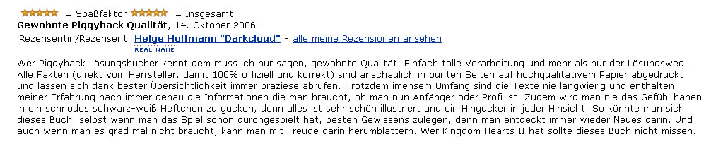 „Wer Piggyback Lösungsbücher kennt, dem muss ich nur sagen: gewohnte Qualität. Einfach tolle Verarbeitung und mehr als nur der Lösungsweg. Alle Fakten (direkt vom Hersteller, und damit 100% offiziell und korrekt) sind anschaulich in bunten Seiten auf hochqualitativem Papier abgedruckt und lassen sich dank bester Übersichtlichkeit immer präzise abrufen. Trotzdem immensem Umfang sind die Texte nie langwierig und enthalten meiner Erfahrung nach immer genau die Informationen, die man braucht – ob man nun Anfänger oder Profi ist. Zudem wird man nie das Gefühl, haben in ein schnödes schwarz-weiß Heftchen zu gucken, denn alles ist sehr schön illustriert und in jeder Hinsicht ein Hingucker. So könnte man sich dieses Buch – selbst wenn man das Spiel schon durchgespielt hat – besten Gewissens zulegen, denn man entdeckt immer wieder Neues darin. Und auch wenn man es grad mal nicht braucht, kann man mit Freude darin herumblättern. Wer Kingdom Hearts II hat, sollte dieses Buch nicht missen.“