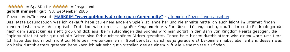 „Das letzte Lösungsbuch, das ich gekauft habe, ist lange her und die Inhalte hätte ich auch leicht im Internet finden können – deshalb war ich skeptisch. Trotzdem habe ich mir als großer Kingdom-Hearts-Fan dieses Lösungsbuch gekauft. Der erste Eindruck nach dem Auspacken: Es sieht groß und dick aus. Beim Aufschlagen des Buches wird man sofort in den Bann von Kingdom Hearts 2 gezogen, die Papierqualität ist sehr gut, und alle Seiten sind farbig mit schönen Bildern gestaltet. Schon beim bloßen Durchblättern wird einem warm ums Herz. […] Anhand dessen, was ich beim Durchblättern gesehen habe, kann ich mir sehr gut vorstellen, dass es einem hilft, alle Geheimnisse zu finden.“