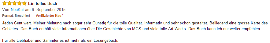 „Ein tolles Buch! Jeden Cent wert. Meiner Meinung nach sogar sehr günstig für die tolle Qualität. Informativ und sehr schön gestaltet. Beiliegend eine große Karte des Gebietes. Das Buch enthält viele Informationen über die Geschichte von MGS und viele tolle Artworks. Das Buch kann ich nur weiterempfehlen. Für alle Liebhaber und Sammler es ist mehr als ein Lösungsbuch.“