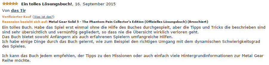 „Ein tolles Buch. Habe das Spiel erst einmal ohne die Hilfe des Buches durchgespielt, aber die beschriebenen Tipps und Tricks sind sehr vernünftig gegliedert, sodass nie die Übersicht verloren geht. Das Buch bietet sowohl Anfängern als auch erfahrenen Spielern umfangreiche Hilfen. Ich habe einige Dinge durch das Buch gelernt, wie zum Beispiel den richtigen Umgang mit dem dynamischen Schwierigkeitsgrad des Spiels. Ich kann das Buch jedem empfehlen, der Tipps zu den Missionen oder auch einfach viele Hintergrundinformationen zur Metal-Gear-Reihe möchte.“