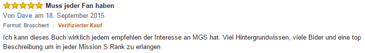 „Ich kann dieses Buch wirklich jedem empfehlen, der Interesse an MGS hat. Viel Hintergrundwissen, viele Bider und eine top Beschreibung, um in jeder Mission einen S-Rang zu erlangen.“