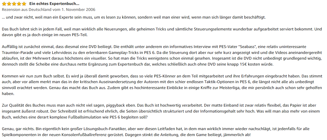 „Ein echtes Expertenbuch – und zwar nicht, weil man ein Experte sein muss, um es lesen zu können, sondern weil man einer wird, wenn man sich länger damit beschäftigt. Das Buch lohnt sich in jedem Fall, weil man wirklich alle Neuerungen, alle geheimen Tricks und sämtliche Steuerungselemente wunderbar aufgearbeitet serviert bekommt. Und davon gibt es ja doch einige im neuen PES-Teil. Auffällig ist zunächst einmal, dass diesmal eine DVD beiliegt. […] Insgesamt ist die DVD nicht unbedingt grundlegend wichtig, dennoch stellt die Scheibe eine durchaus nette Ergänzung zum Expertenbuch dar, welches schließlich auch ohne DVD seine knapp 15€ kosten würde. Kommen wir nun zum Buch selbst. Es wird ja überall damit geworben, dass so viele PES-Könner an dem Teil mitgearbeitet und ihre Erfahrungen eingebracht haben. Das stimmt auch, aber vor allem merkt man das in der kritischen Auseinandersetzung der Autoren mit den schier endlosen Taktik-Optionen in PES 6, die längst nicht alle als unbedingt sinnvoll erachtet werden. Genau das macht das Buch aus. Zudem gibt es hochinteressante Einblicke in einige Kniffe zur Meisterliga, die mir persönlich auch schon sehr geholfen haben. Zur Qualität des Buches muss man auch nicht viel sagen, Piggyback eben. Das Buch ist hochwertig verarbeitet. Der matte Einband ist zwar relativ flexibel, das Papier ist aber insgesamt äußerst robust. Der Schreibstil ist erfrischend ehrlich, die Seiten übersichtlich strukturiert und der Informationsgehalt sehr hoch. Was will man also mehr von einem Buch, welches eine derart komplexe Fußballsimulation wie PES 6 begleiten soll? Genau, gar nichts. Bin eigentlich kein großer Lösungsbuch-Fanatiker, aber wer diesen Leitfaden hat, in dem man wirklich immer wieder nachschlägt, ist jedenfalls für alle Spielkomponenten in der neuen Konsolenfußballreferenz gerüstet. Dagegen stinkt die Anleitung, die dem Game beiliegt, jämmerlich ab!“