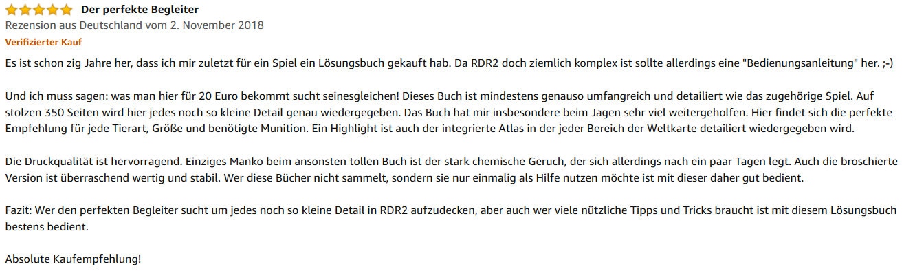 „Was man hier für 20 Euro bekommt, sucht seinesgleichen! Dieses Buch ist mindestens genauso umfangreich und detailiert, wie das zugehörige Spiel. Auf über 350 Seiten wird hier jedes noch so kleine Detail genau wiedergegeben. Das Buch hat mir insbesondere beim Jagen sehr viel weitergeholfen. Hier findet sich die perfekte Empfehlung für jede Tierart, Größe und benötigte Munition. Ein Highlight ist auch der integrierte Atlas, in dem jeder Bereich der Weltkarte detailiert wiedergegeben wird. […] Fazit: Wer den perfekten Begleiter sucht, um jedes noch so kleine Detail in RDR2 aufzudecken, aber auch wer viele nützliche Tipps und Tricks braucht, ist mit diesem Lösungsbuch bestens bedient. Absolute Kaufempfehlung!“
