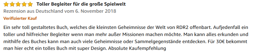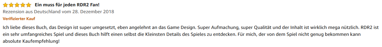 „Toller Begleiter für die große Spielwelt! Ein sehr toll gestaltetes Buch, welches auch die kleinsten Geheimnisse der Welt von RDR2 offenbart. Auf jeden Fall ein toller und hilfreicher Begleiter, wenn man mehr außer Missionen machen möchte. Man kann alles erkunden und mithilfe des Buches auch viele Geheimnisse oder Sammelgegenstände entdecken. Für 30 Euro bekommt man hier echt ein tolles Buch mit super Design. Absolute Kaufempfehlung“
