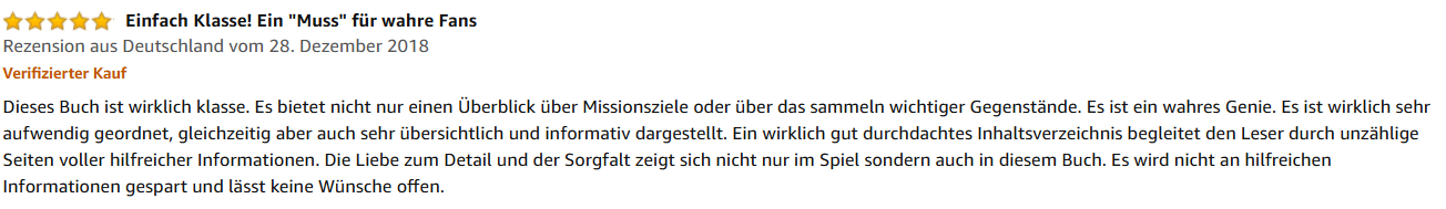 „Dieses Buch ist wirklich klasse. Es bietet nicht nur einen Überblick über Missionsziele oder über das Sammeln wichtiger Gegenstände. Es ist ein wahres Genie. Es ist wirklich sehr aufwendig geordnet, gleichzeitig aber auch sehr übersichtlich und informativ dargestellt. Ein wirklich gut durchdachtes Inhaltsverzeichnis begleitet den Leser durch unzählige Seiten voller hilfreicher Informationen. Die Liebe zum Detail und Sorgfalt zeigt sich nicht nur im Spiel, sondern auch in diesem Buch. Es wird nicht an hilfreichen Informationen gespart und lässt keine Wünsche offen.“