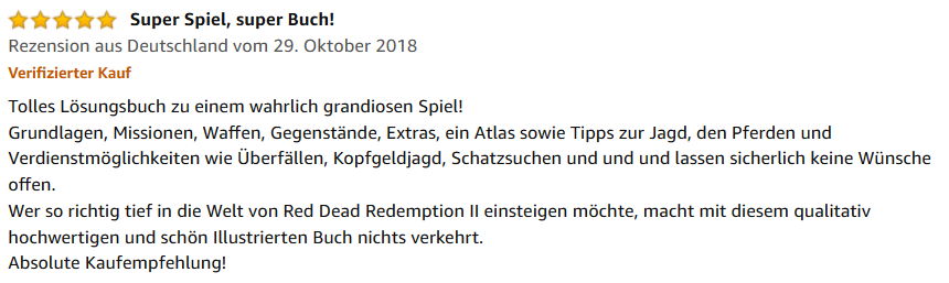 „Tolles Lösungsbuch zu einem wahrlich grandiosen Spiel! Grundlagen, Missionen, Waffen, Gegenstände, Extras, ein Atlas sowie Tipps zur Jagd, den Pferden und Verdienstmöglichkeiten wie Überfällen, Kopfgeldjagd, Schatzsuchen etc. sicherlich keine Wünsche offen. Wer so richtig tief in die Welt von Red Dead Redemption II einsteigen möchte, macht mit diesem qualitativ hochwertigen und schön Illustrierten Buch nichts verkehrt. Absolute Kaufempfehlung!“
