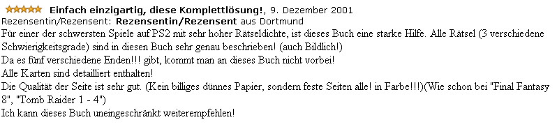 „Für eines der schwersten Spiele auf PS2 mit sehr hoher Rätseldichte ist dieses Buch eine starke Hilfe. Alle Rätsel (3 verschiedene Schwierigkeitsgrade) sind in diesem Buch sehr genau beschrieben, auch bildlich! Da es fünf verschiedene Enden gibt, kommt man an diesem Buch nicht vorbei! Alle Karten sind detailliert enthalten! Die Qualität der Seiten ist sehr gut. Kein billiges dünnes Papier, sondern feste Seiten, alle in Farbe! […] Ich kann dieses Buch uneingeschränkt weiterempfehlen!“