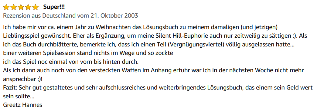 „Super! Ich habe mir vor ca. einem Jahr zu Weihnachten das Lösungsbuch zu meinem damaligen (und jetzigen) Lieblingsspiel gewünscht. Eher als Ergänzung, um meine Silent-Hill-Euphorie auch nur zeitweilig zu sättigen. Als ich das Buch durchblätterte, bemerkte ich, dass ich einen Teil (Vergnügungsviertel) völlig ausgelassen hatte… Einer weiteren Spielsession stand nichts im Wege und so zockte ich das Spiel noch einmal von vorn bis hinten durch. Als ich dann auch noch von den versteckten Waffen im Anhang erfuhr war ich in der nächsten Woche nicht mehr ansprechbar. Fazit: Sehr gut gestaltetes und sehr aufschlussreiches und weiterbringendes Lösungsbuch, das einem sein Geld wert sein sollte.“
