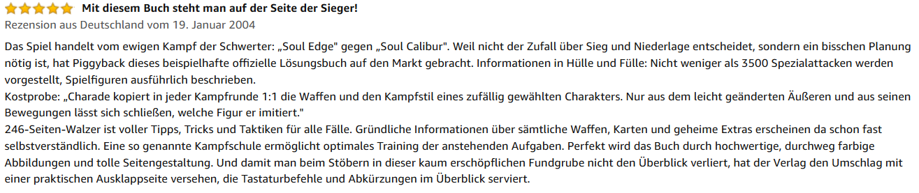 „Das Spiel handelt vom ewigen Kampf der Schwerter: Soul Edge gegen Soul Calibur. Weil nicht der Zufall über Sieg und Niederlage entscheidet, sondern ein bisschen Planung nötig ist, hat Piggyback dieses beispielhafte offizielle Lösungsbuch auf den Markt gebracht. Informationen in Hülle und Fülle: Nicht weniger als 3500 Spezialattacken werden vorgestellt, Spielfiguren ausführlich beschrieben. Der 246-Seiten-Walzer ist voller Tipps, Tricks und Taktiken für alle Fälle. Gründliche Informationen über sämtliche Waffen, Karten und geheime Extras erscheinen da schon fast selbstverständlich. Eine so genannte Kampfschule ermöglicht optimales Training der anstehenden Aufgaben. Perfekt wird das Buch durch hochwertige, durchweg farbige Abbildungen und tolle Seitengestaltung.“