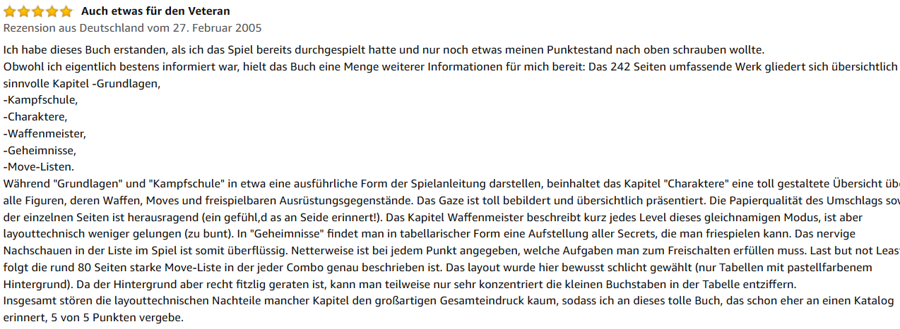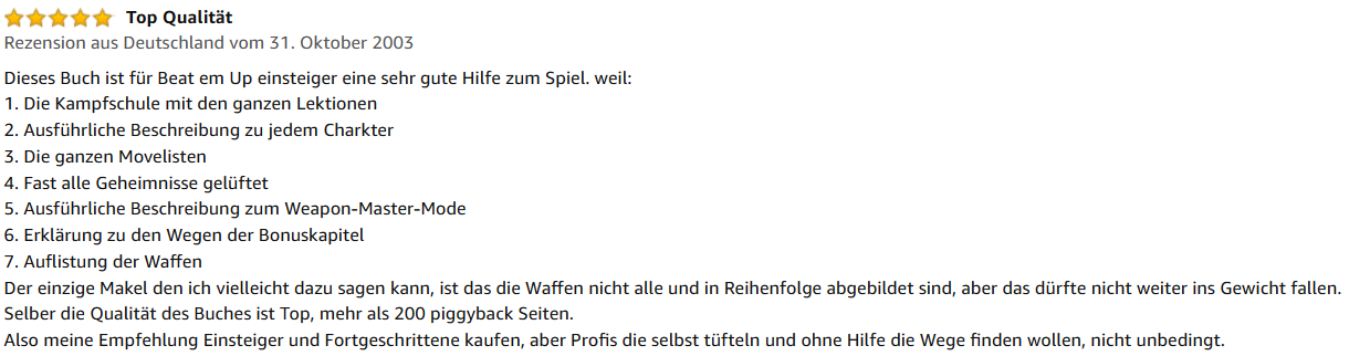 „Dieses Buch ist für Beat em Up einsteiger eine sehr gute Hilfe zum Spiel. Der einzige Makel, den ich vielleicht dazu nennen kann, ist, dass die Waffen nicht alle und in Reihenfolge abgebildet sind, aber das dürfte nicht weiter ins Gewicht fallen. Die Qualität des Buchs an sich ist top mit mehr als 200 Piggyback-Seiten. Also meine Empfehlung: Einsteiger und Fortgeschrittene kaufen, aber Profis, die selbst tüfteln und ohne Hilfe die Wege finden wollen, nicht unbedingt.“