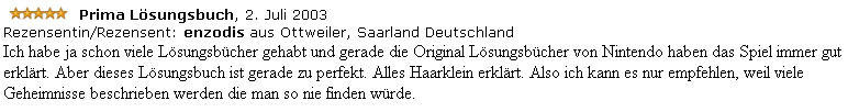 „Prima Lösungsbuch! Ich habe ja schon viele Lösungsbücher gehabt und gerade die Original-Lösungsbücher von Nintendo haben das Spiel immer gut erklärt. Aber dieses Lösungsbuch ist geradezu perfekt. Alles haarklein erklärt. Ich kann es also nur empfehlen, weil viele Geheimnisse beschrieben werden, die man so nie finden würde.“