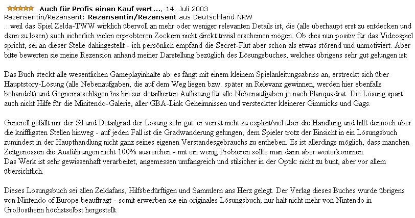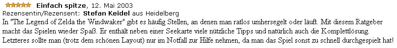 „In ‚The Legend of Zelda: The Windwaker‘ gibt es häufig Stellen, an denen man ratlos umhersegelt oder -läuft. Mit diesem Ratgeber macht das Spielen wieder Spaß. Er enthält neben einer Seekarte viele nützliche Tipps und natürlich auch die Komplettlösung. Letztere sollte man (trotz des schönen Layouts) nur im Notfall zur Hilfe nehmen, da man das Spiel sonst zu schnell durchgespielt hat!“