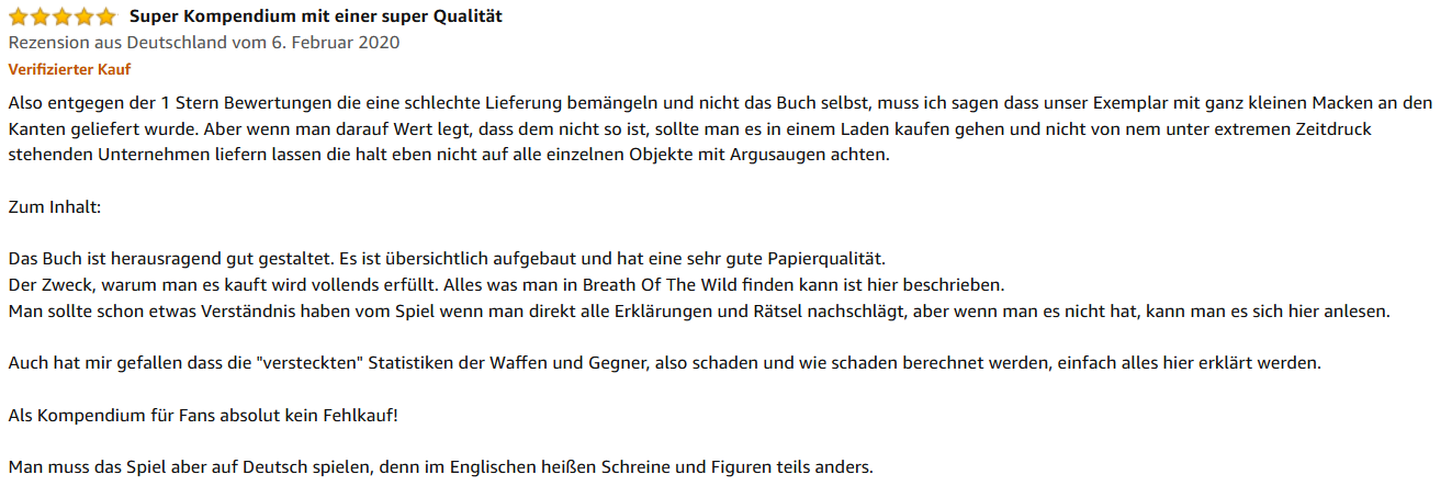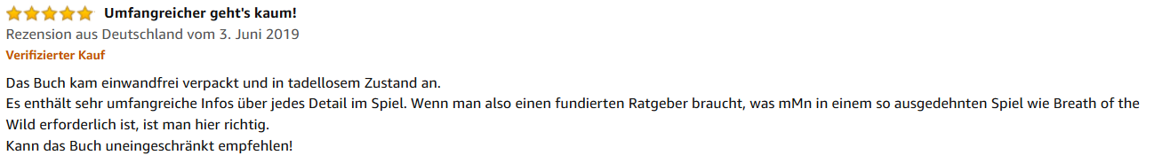 „Das Buch enthält sehr umfangreiche Infos über jedes Detail im Spiel. Wenn man also einen fundierten Ratgeber braucht, was meiner Meinung nach in einem so ausgedehnten Spiel wie Breath of the Wild erforderlich ist, ist man hier richtig. Kann das Buch uneingeschränkt empfehlen!“