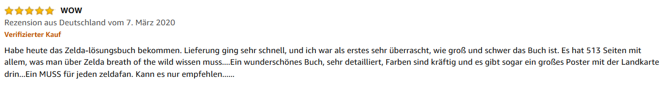 „Habe heute das Zelda-Lösungsbuch bekommen und ich war als erstes sehr überrascht, wie groß und schwer das Buch ist. Es hat 512 Seiten mit allem, was man über Zelda: Breath of the Wild wissen muss. Ein wunderschönes Buch – sehr detailliert, die Farben sind kräftig und es gibt sogar ein großes Poster mit der Landkarte dazu. Ein MUSS für jeden Zelda-Fan. Kann es nur empfehlen.“