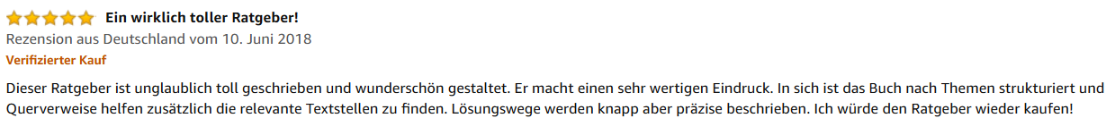 „Dieser Ratgeber ist unglaublich toll geschrieben und wunderschön gestaltet. Er macht einen sehr wertigen Eindruck. In sich ist das Buch nach Themen strukturiert und Querverweise helfen zusätzlich, die relevanten Textstellen zu finden. Lösungswege werden knapp aber präzise beschrieben. Ich würde den Ratgeber wieder kaufen!“