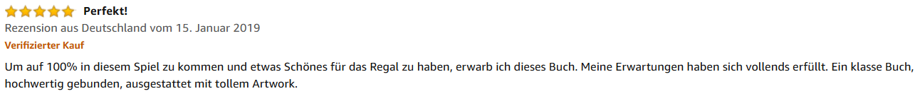 „Um auf 100% in diesem Spiel zu kommen und etwas Schönes für das Regal zu haben, erwarb ich dieses Buch. Meine Erwartungen haben sich vollends erfüllt. Ein klasse Buch, hochwertig gebunden, ausgestattet mit tollem Artwork.“