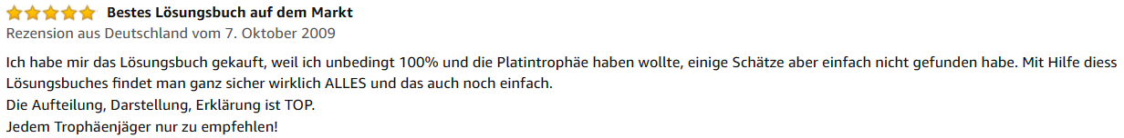 „Ich habe mir das Lösungsbuch gekauft, weil ich unbedingt 100% und die Platintrophäe haben wollte, einige Schätze aber einfach nicht gefunden habe. Mit Hilfe diess Lösungsbuches findet man ganz sicher wirklich ALLES und das auch noch einfach. Die Aufteilung, Darstellung, Erklärung ist TOP. Jedem Trophäenjäger nur zu empfehlen!“