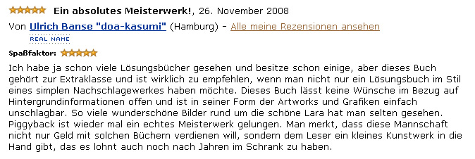 „Ich habe ja schon viele Lösungsbücher gesehen und besitze schon einige, aber dieses Buch gehört zur Extraklasse und ist wirklich zu empfehlen, wenn man nicht nur ein Lösungsbuch im Stil eines simplen Nachschlagewerkes haben möchte. Dieses Buch lässt keine Wünsche im Bezug auf Hintergrundinformationen offen und ist in seiner Form der Artworks und Grafiken einfach unschlagbar. So viele wunderschöne Bilder rund um die schöne Lara hat man selten gesehen. Piggyback ist wieder mal ein echtes Meisterwerk gelungen. Man merkt, dass diese Mannschaft nicht nur Geld mit solchen Büchern verdienen will, sondern dem Leser ein kleines Kunstwerk in die Hand gibt, das es lohnt auch noch nach Jahren im Schrank zu haben.“
