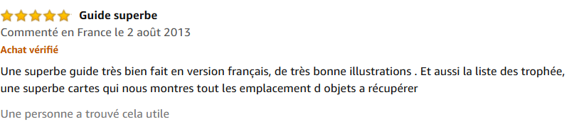 « Un superbe guide très bien fait en version française, de très bonnes illustrations . Et aussi la liste des trophées, une superbe carte qui nous montre tous les emplacements d’objets à récupérer. »