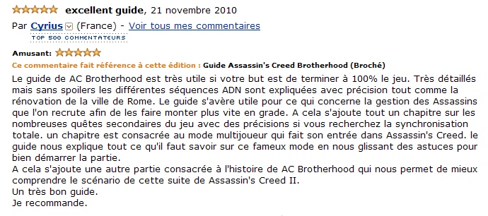 « Le guide de AC Brotherhood est très utile si votre but est de terminer à 100% le jeu. Très détaillé mais sans spoilers, les différentes séquences ADN y sont expliquées avec précision tout comme la rénovation de la ville de Rome. Le guide s’avère utile pour ce qui concerne la gestion des Assassins que l’on recrute afin de les faire monter plus vite en grade. A cela s’ajoute tout un chapitre sur les nombreuses quêtes secondaires du jeu avec des précisions si vous recherchez la synchronisation totale. Un chapitre est consacrée au mode multijoueur qui fait son entrée dans Assassin’s Creed. Le guide nous explique tout ce qu’il faut savoir sur ce fameux mode en nous glissant des astuces pour bien démarrer la partie. A cela s’ajoute une autre partie consacrée à l’histoire de AC Brotherhood qui nous permet de mieux comprendre le scénario de cette suite de Assassin’s Creed II. Un très bon guide que je recommande. »