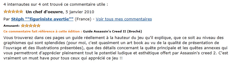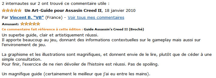 « Vous trouverez dans ces pages un guide réellement à la hauteur du jeu qu’il explique, que ce soit au niveau des graphismes qui sont splendides (pour moi, c’est quasiment un art book au vu de la qualité de présentation de l’ouvrage et des illustrations présentées), que des détails concernant la quête principale et les quêtes annexes qui vous permettront d’apprécier pleinement tout le potentiel ludique et esthétique offert par Assassin’s creed 2. C’est vraiment un must have pour tous ceux qui apprécié ce jeu !! »
