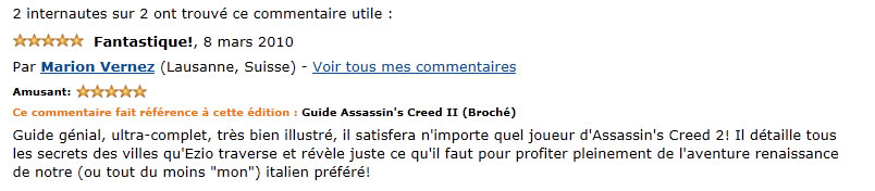 « Guide génial, ultra-complet, très bien illustré, il satisfera n’importe quel joueur d’Assassin’s Creed 2! Il détaille tous les secrets des villes qu’Ezio traverse et révèle juste ce qu’il faut pour profiter pleinement de l’aventure renaissance de notre (ou tout du moins « mon ») italien préféré! »