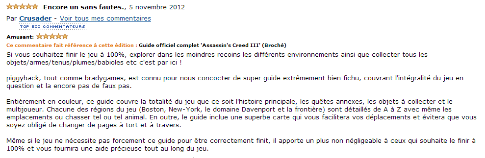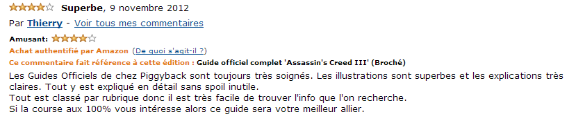 « Voilà enfin le guide officiel du dernier arrivé Assassin’s Creed 3. Toujours aussi bien detaillé et bien imagé, obligatoire pour les fans collectionneurs ou pour les fureurs qui veulent finir le jeu à 100%. 100% satisfait. »