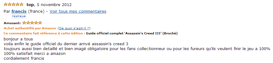 Commentaires clients Amazon, 05/11/2012