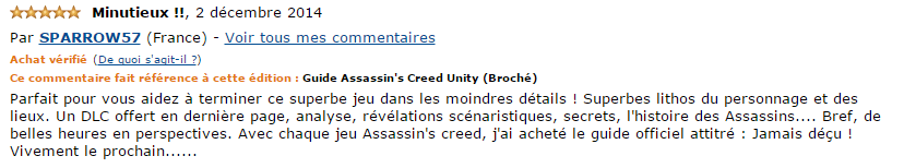 « Parfait pour vous aider à terminer ce superbe jeu dans les moindres détails ! Superbes lithos du personnage et des lieux. Un DLC offert en dernière page, analyse, révélations scénaristiques, secrets, l’histoire des Assassins…. Bref, de belles heures en perspective. Avec chaque jeu Assassin’s creed, j’ai acheté le guide officiel attitré : Jamais déçu ! Vivement le prochain. »