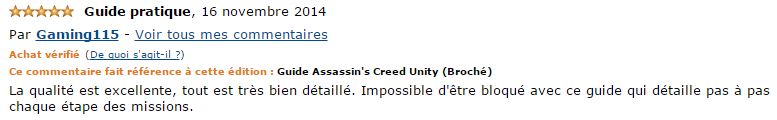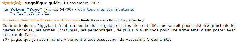 « Comme toujours, Piggyback à fait du bon boulot ce guide est tres bien detaillé, que se soit pour l’histoire principale les quetes annexes, les armes, costumes, les personnages, de plus il y a un code pour une arme ainsi qu’un poster avec la carte de Paris. 307 pages que je recommande vivement à tout possesseur de Assassin’s Creed Unity. »