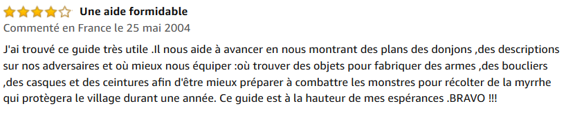 « J’ai trouvé ce guide très utile. Il nous aide à avancer en nous montrant des plans des donjons, des descriptions sur nos adversaires et où mieux nous équiper : où trouver des objets pour fabriquer des armes, des boucliers, des casques et des ceintures afin d’être mieux préparé à combattre les monstres pour récolter de la myrrhe qui protègera le village durant une année. Ce guide est à la hauteur de mes espérances. BRAVO !!! »